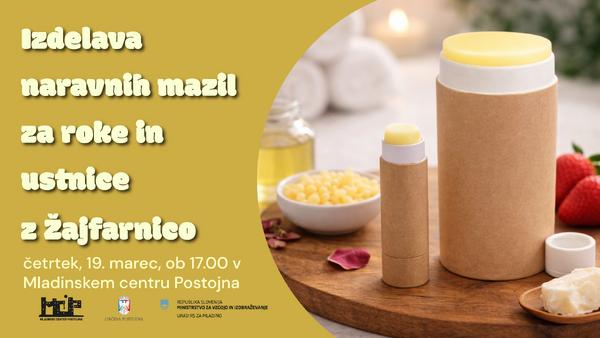 "description":"Delavnica izdelave naravnih mazil za roke in ustnice z Žajfarnico\nhttps://www.mcp.si//program/1/Delavnica-izdelave-naravnih-mazil-za-roke-in-ustnice-z-ajfarnico-2026-03-19",